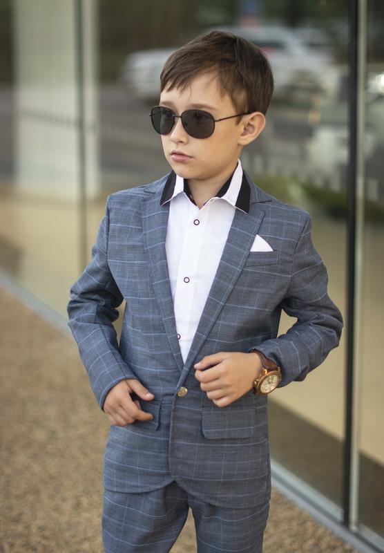 Вот такой неповторимый образ можно придумать для своего сына. Серый костюм в клетку — классика жанра, а чёрные полоски на вороте рубашки добавят яркий акцент.
